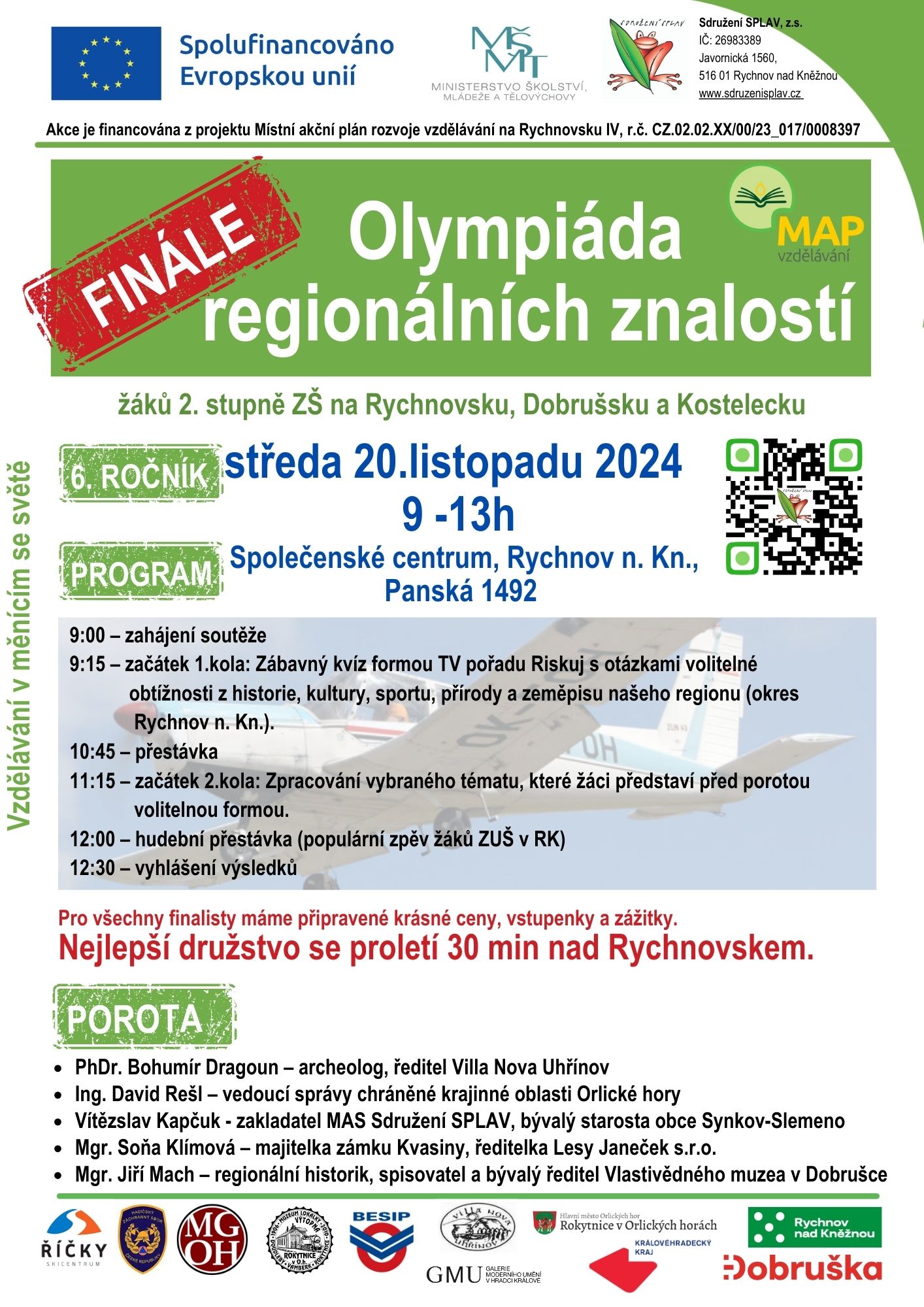 Letos jsme uspořádali již 6.ročník Olympiády regionálních znalostí žáků 2. stupně ZŠ z celého okresu Rychnov n. Kn. Soutěž je jednou z aktivit podporujících vzdělanost a vztah mladých obyvatel k obcím a regionu, kde žijí. Otázky do soutěže připravili a v porotě zasedli významní odborníci Jiří Mach, Soňa Klímová (Janečková), Vítězslav Kapčuk, David Rešl a Bohumír Dragoun, předseda poroty. Celkem 127 tříčlenných družstev z 18 základních škol se zúčastnilo 23.10.2024 1. kola soutěže a odpovídalo online na 50 otázek z oblasti historie, přírodopisu, zeměpisu a osobnosti regionu. Deset nejúspěšnějších týmů podle bodového zisku postoupilo do 2. finálového kola, kde 20.11.2024 bojovala o vítězství družstva ze škol ZŠ Rokytnice v O. h., Gymnázium F.M. Pelcla v Rychnově n. Kn., ZŠ Javornická v Rychnově n. Kn. a ZŠ Masarykova v Rychnově n. Kn.. Sál Společenského centra v Rychnově nad Kněžnou byl plný fandících spolužáků, kamarádů. Žáci odpovídali na otázky jako v TV pořadu Riskuj a na velkoplošné obrazovce si vybírali z témat příroda, historie, zeměpis, osobnosti nebo riskuj. V tématu riskuj se v letošním roce skrývaly otázky k výročí 20 let, které naše MAS letos slaví. Téma a obtížnost otázky volili žáci podle vlastní strategie. V druhé části finále žáci představili volitelnou formou výsledky domácí práce na téma 20 let v mé obci. Na přípravu měli soutěžící tři týdny a výsledky jejich snažení a bujné fantazie ohodnotil každý člen poroty až 300 body. Letošní ročník olympiády obohatila účast složek záchranného systému, svoji práci a edukační programy pro školy představili hasiči, Český červený kříž, Besip a také rychnovská střední škola VOŠ a SPŠ. Finále zpestřila děvčata ze Základní umělecké školy v Rychnově n. Kn. zpěvem populárních písní. Po sečtení bodového zisku z obou částí soutěže byli vyhlášeni vítězové soutěže, smíšené družstvo ze ZŠ Rokytnice v O.h, kteří si říkali Julinčáci a získali tak hlavní výhru, let nad Rychnovskem.