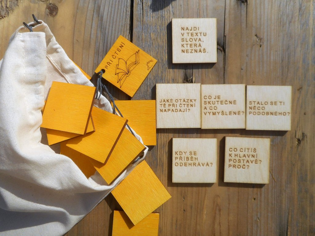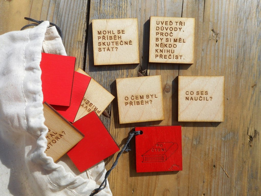 čtverečků) – PO ČTENÍ (červená barva, 29 čtverečků). - V každém pytlíku naleznete dřevěné čtverečky 4*4 cm s